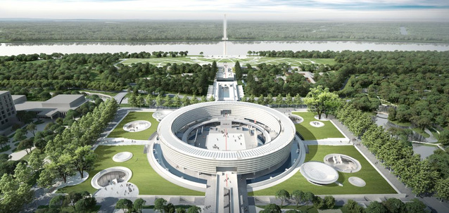 項(xiàng)目建設(shè)范圍總面積約為62000 平方米。建設(shè)內(nèi)容包含憲法展廳及宣誓廣場(chǎng)、法之谷城市綠坡及配套設(shè)施、場(chǎng)地東西兩側(cè)的人行天橋、場(chǎng)地東側(cè)的公園主入口廣場(chǎng)等(場(chǎng)地北側(cè)的濕地公園維持現(xiàn)狀,不做開(kāi)發(fā))。容積率 0.09,建筑密度 9%,綠地率 36.8%。本項(xiàng)目總建筑面積為 29896 平方米,其中地上建筑面積 5584 平方米,地下建筑面積24312 平方米,建筑高度 16.5米,地上 2 層(首層架空),地下 1 層。功能包含展覽及地下車庫(kù)等。